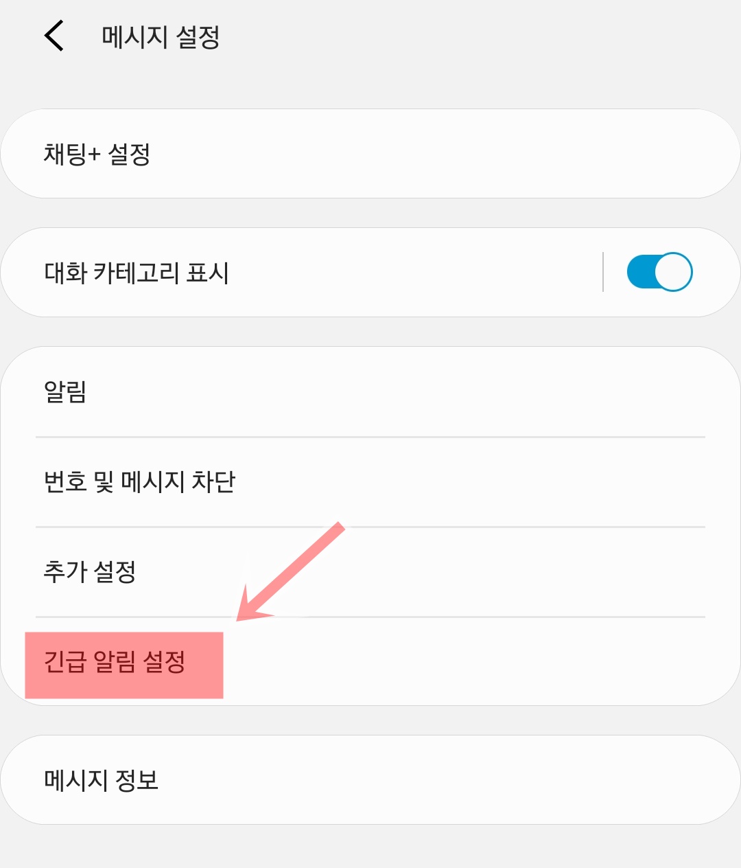 메시지 설정에서 긴급 알림 설정을 클릭 합니다