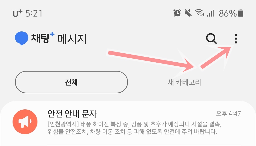 우선 긴급재난문자를 차단하거나 푸는 방법을 알아보도록 하겠습니다 문자메시지 화면으로 가서 세로로된 ... 더보기 메뉴를 클릭 합니다