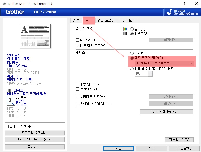그리고 마지막으로 고급 메뉴에서 DL 봉투로 바뀌 주시면 확인을 누르면 설정이 끝납니다