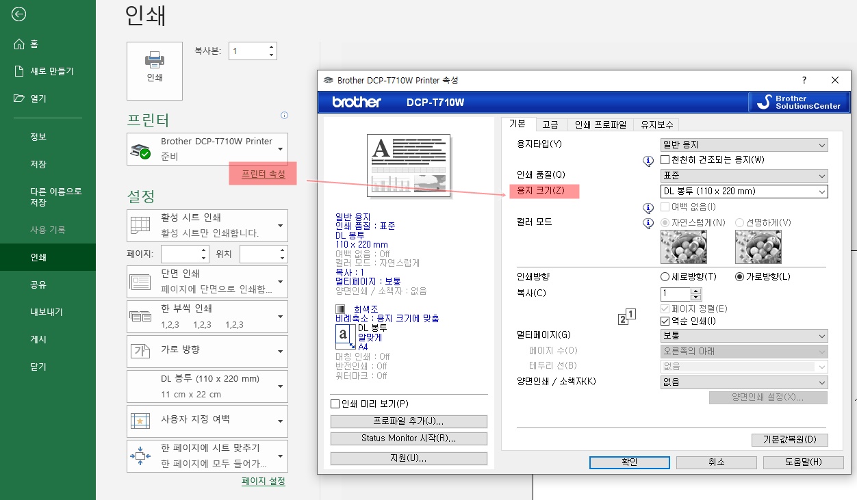 그리고 프린터 속성 메뉴 기본에서 용지 크기를 DL 봉투로 설정합니다