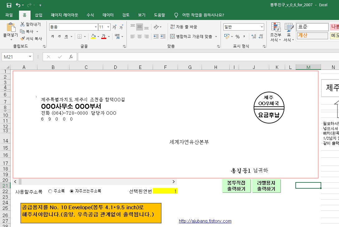 아주방이 만드신 봉투 친구입니다 엑셀로 만들어진 봉투 직접 출력과 라벨 만들기를 할 수 있는 엑셀 파일입니다 최대 1,000까지의 주소록 입력으로 봉투를 직접 출력할 수 있고 DM 발송용 라벨을 만들어서 출력이 가능합니다