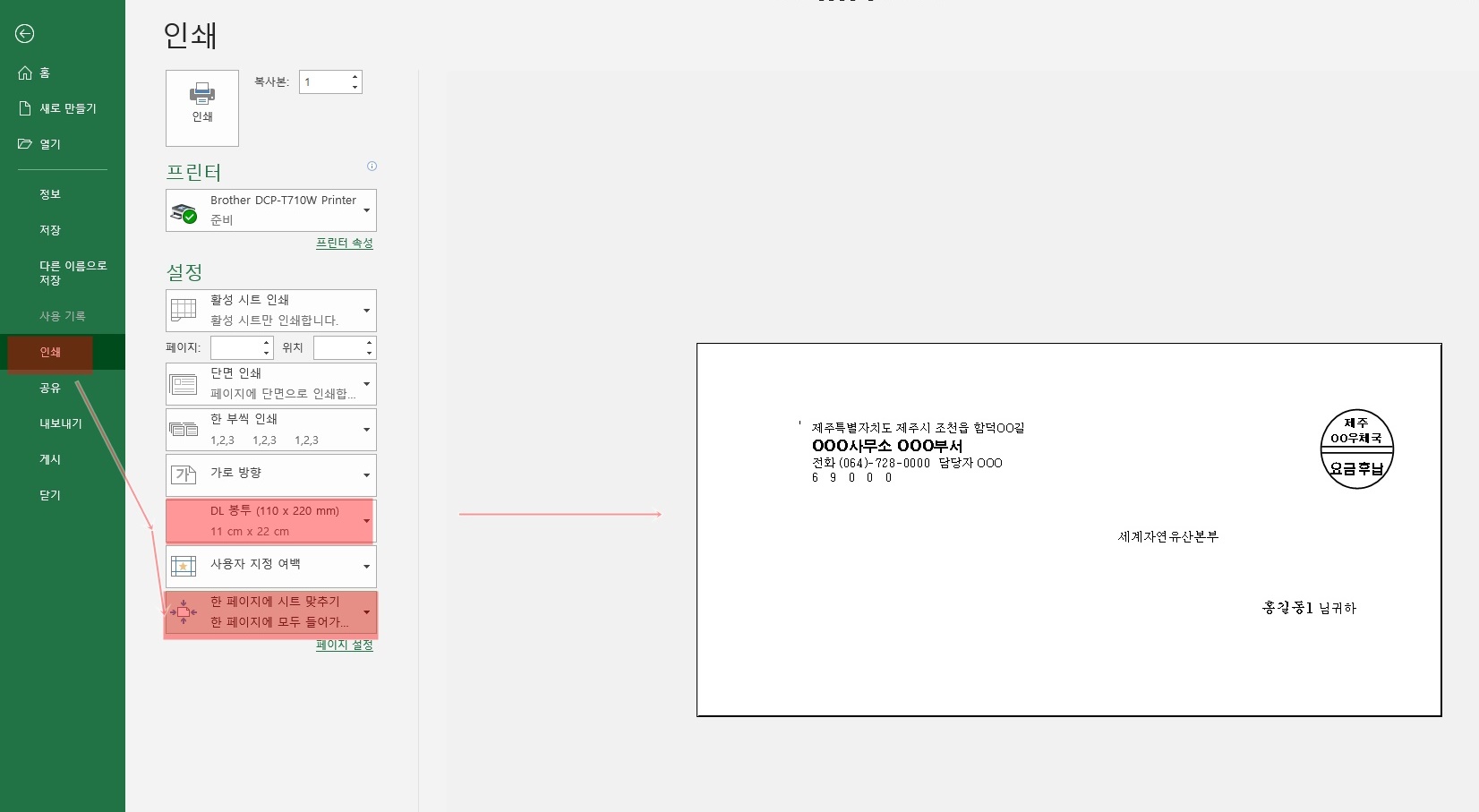 파일 메뉴에서 인쇄를 클릭하시고 빨간색 부분을 똑같이 맞추어 줍니다 DL 봉투를 선택하시고 한 페이지에 시트 맞추기를 하셔야만 봉투 크기에 맞게 다 인쇄가 됩니다