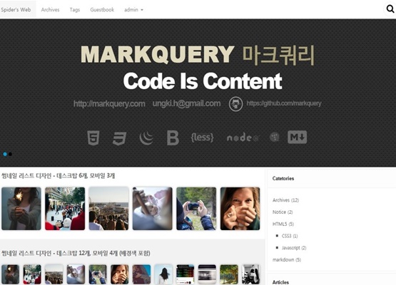 과거와 현재에도 많은 블로거들이 이용하고 있는 마크쿼리의 Spider's Web(스파이더웹) 반응형 스킨 입니다 깔끔한 디자인으로 승부한 심플한 스킨 입니다 지금은 제작자가 무슨 이유에서인지는 모르지만 업데이트와 배포가 중단되었습니다