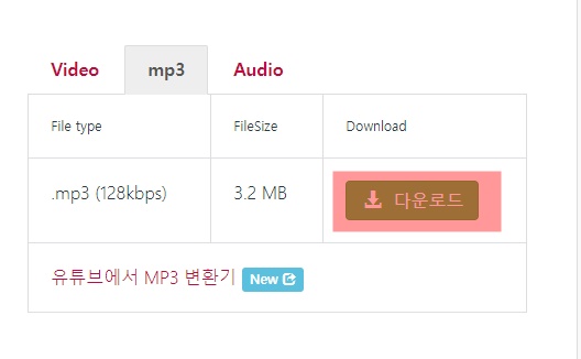 mp3 음악파일로 변환해서 받고 싶으시면 video 옆에 mp3 탭을 클릭하셔서 다운로드 받으면 됩니다 그리고 mp3 탭창을 눌렀는데 인터넷창이 뜨면은 닫고 다운을 진행하시면 됩니다