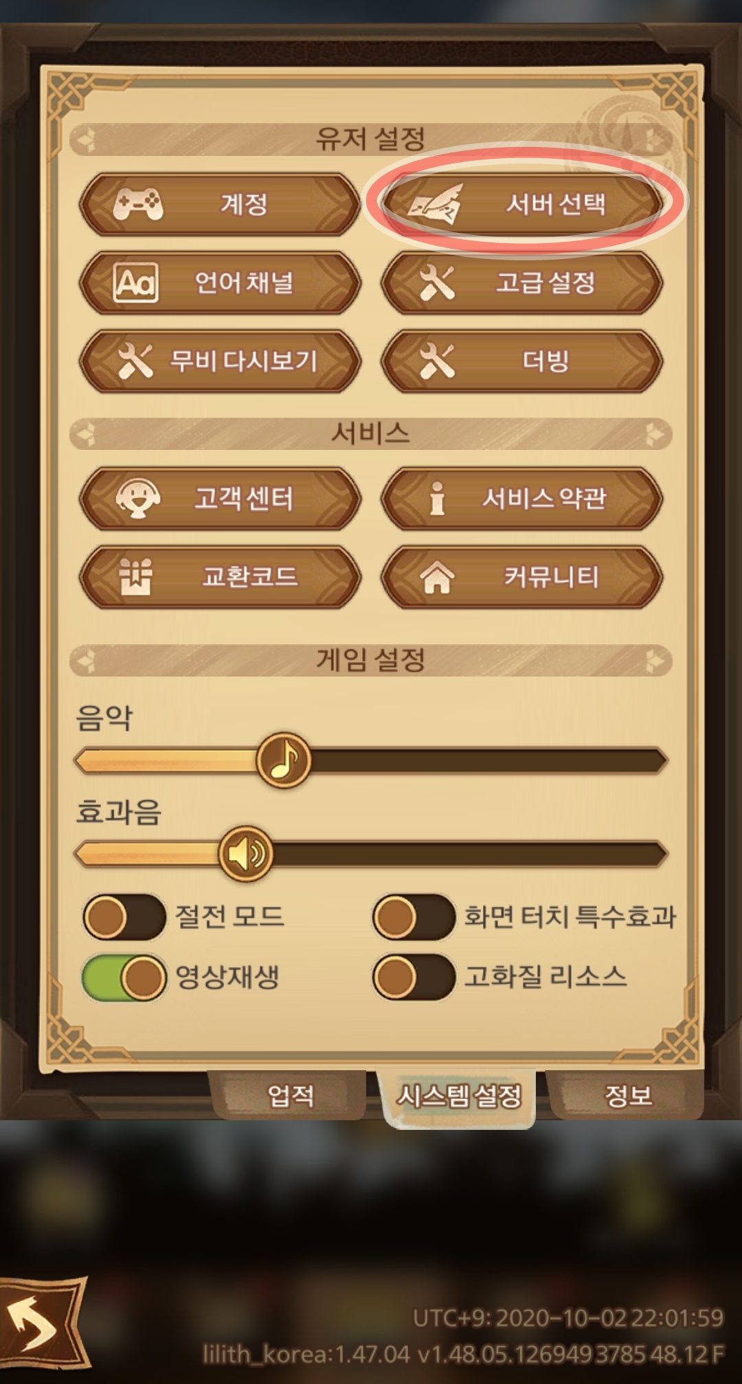 유저 설정에 서버 선택을 클릭 합니다