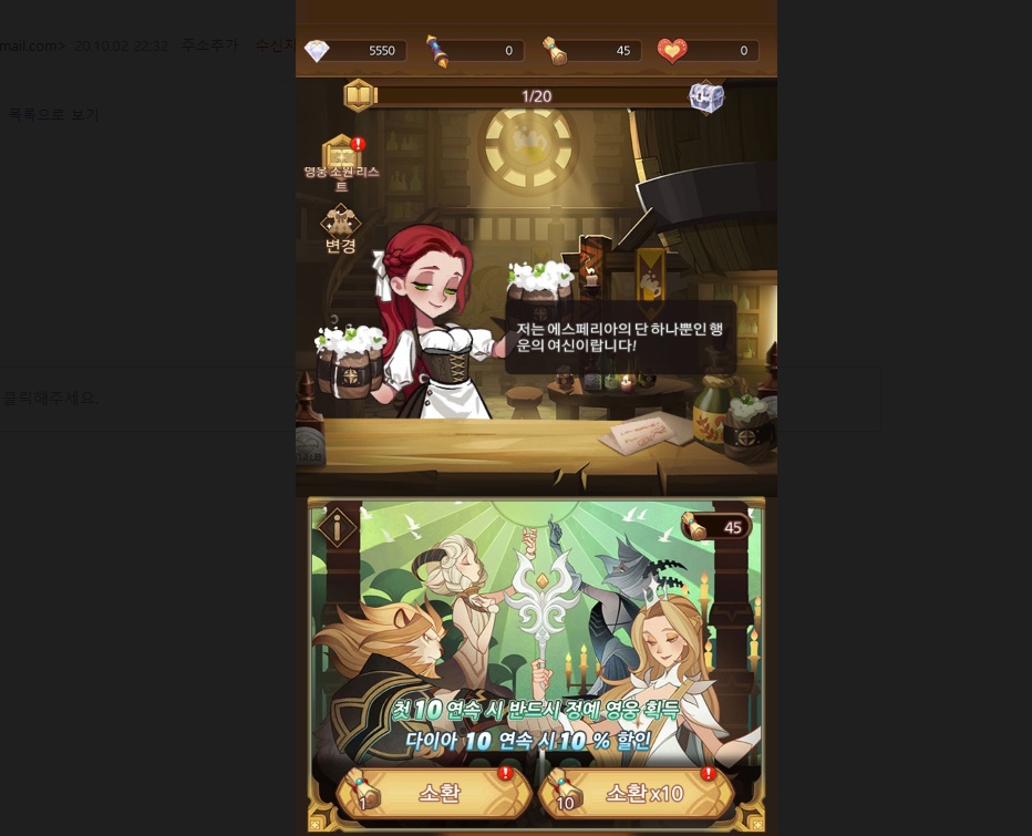 퀘스트와 쿠폰 등록으로 모은 다이아랑 소환권 입니다 이걸로 영웅을 뽑으시면 됩니다