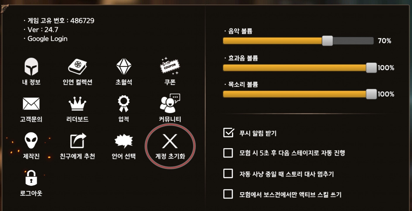 메뉴에서 계정 초기화를 클릭 합니다