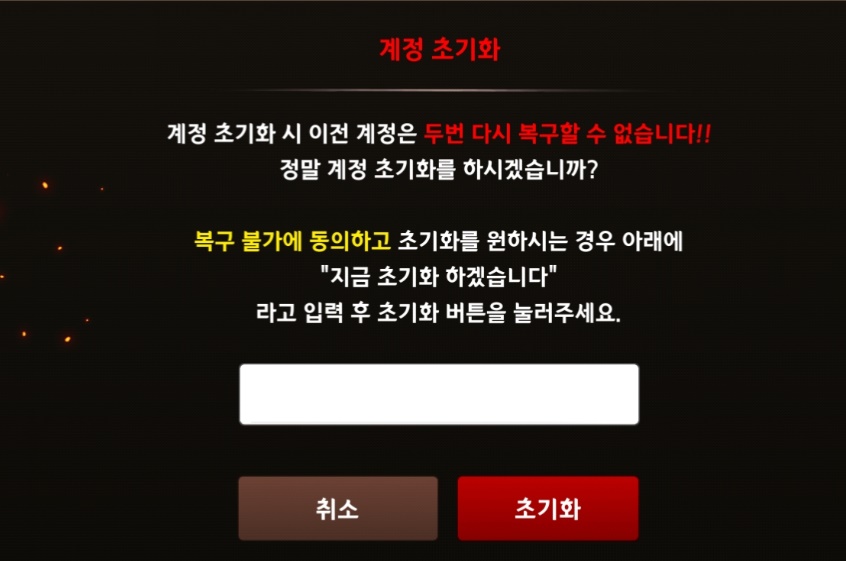 빈 입력란에 지금 초기화 하겠습니다 라고 글을 치시고 초기화를 누르면 초기화가 진행이 됩니다 이후 다시 게임이 실행되고 원래 하던 계정으로 다시 시작이 된답니다