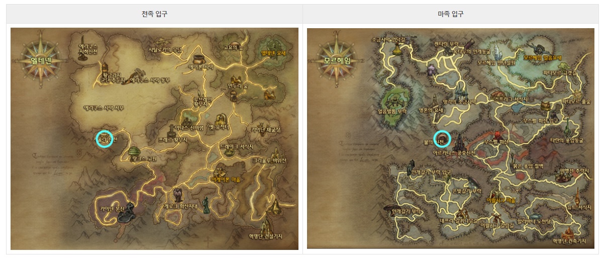 천족은 엘테넨, 마족은 모르헤임에 입구가 있습니다 위치를 잘 보시고 게임상의 지도를 키신후 키울라 신전으로 이동 하시면 됩니다