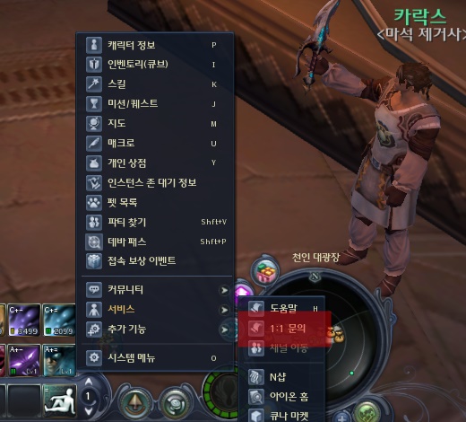 좌측에 ▲ 서비스 < 1:1 문의를 클릭 합니다