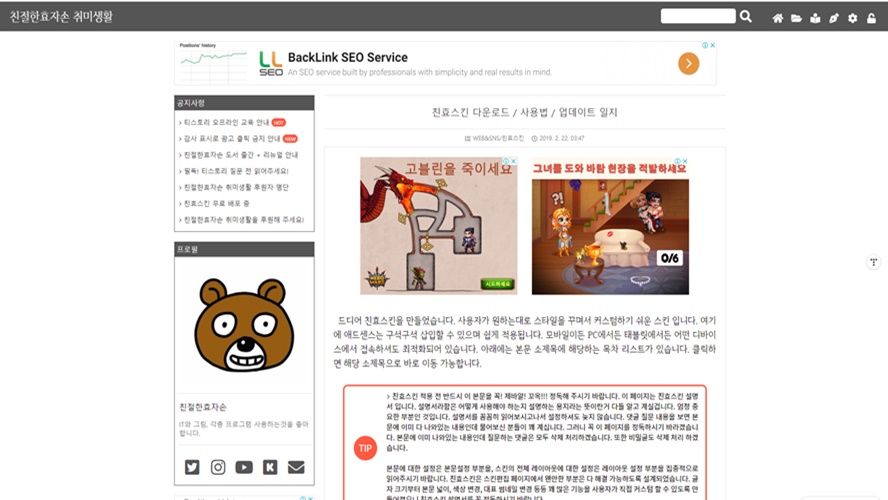드디어 친효스킨을 만들었습니다. 사용자가 원하는대로 스타일을 꾸며서 커스텀하기 쉬운 스킨 입니다. 여기에 애드센스는 구석구석 삽입할 수 있으며 쉽게 적용됩니다. 모바일이든 PC에서든