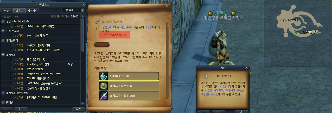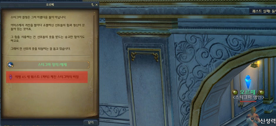 슈라크 주화 일일 퀘스트를 완료 하신후 엘리시움 수호자의 전당에서 엘리베이터를 타시고 스티그마 명인 오르페 NPC를 찾아서 [파티]깨진 스티그마의 비밀 퀘스트를 받습니다