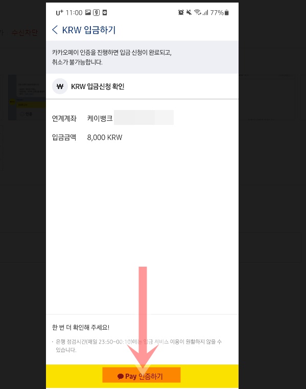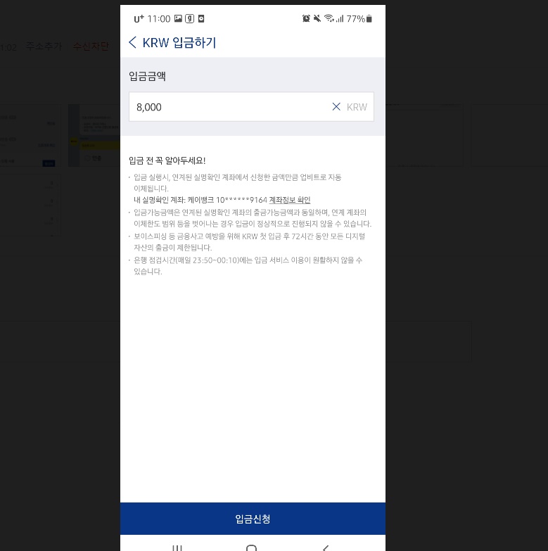 카카오페이 본인인증을 하시고 (이미 하신분은 안하셔도 됩니다) 다시 업비트 앱으로 와서 입금금액을 입력하고 입금신청을 합니다