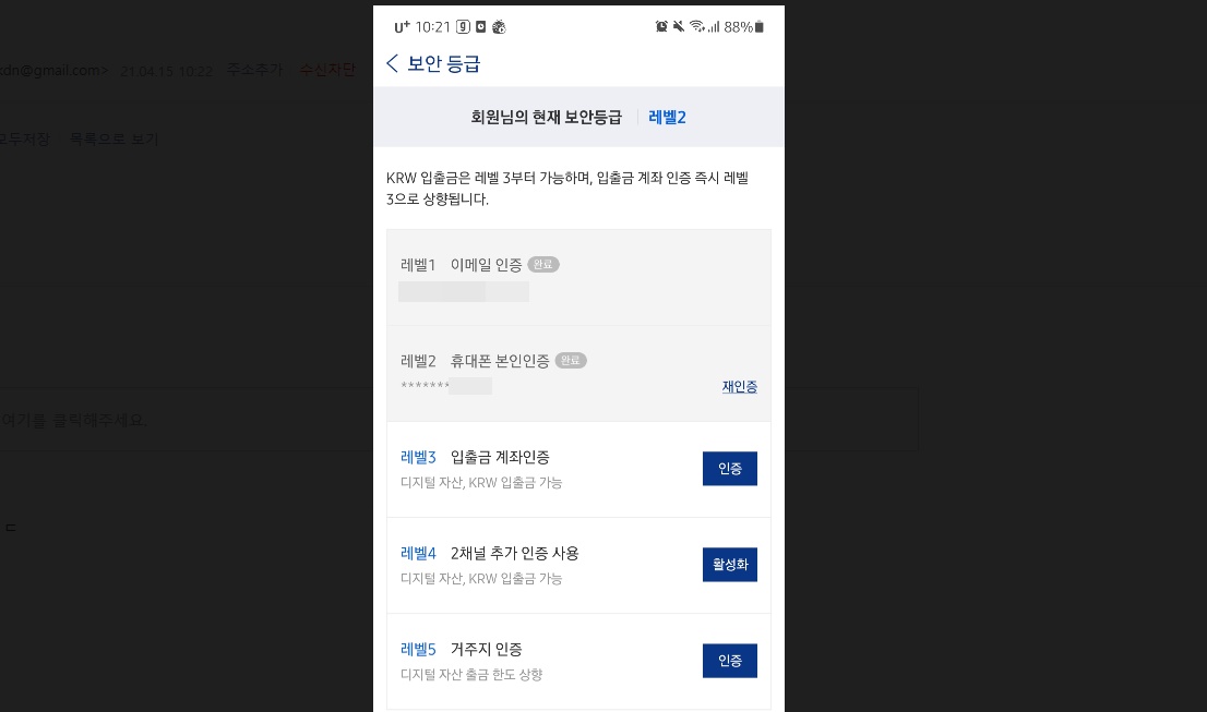 레벨1은 이메일 인증, 레벨 2는 휴대폰 본인인증, 레벨 3은 입출금 계좌인증인데 이 계좌는 케이뱅크 앱을 통해서만 가능 합니다 레벨 4, 2채널 추가 인증 사용을 활성화 시킬수 있습니다
