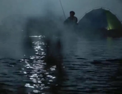 이상하다 싶어서 텐트를 열고 밖에 나가보니까 물 위의 남자가 서 있었다 순간 아빠는 사람이 아니라는것을 아셨다