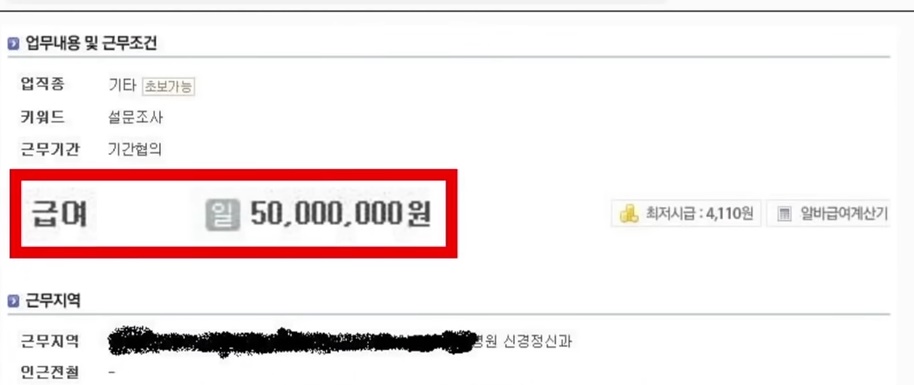 2010년 모 아르바이트 구인 사이트에서 올라온 한 구인 공고가 누리꾼 사이에서 엄청난 화제가 되었다5개월 급여가 무려 5천만 원 이었다 그니까 한 달에 1천만 원을 버는 개꿀 아르바이트였다