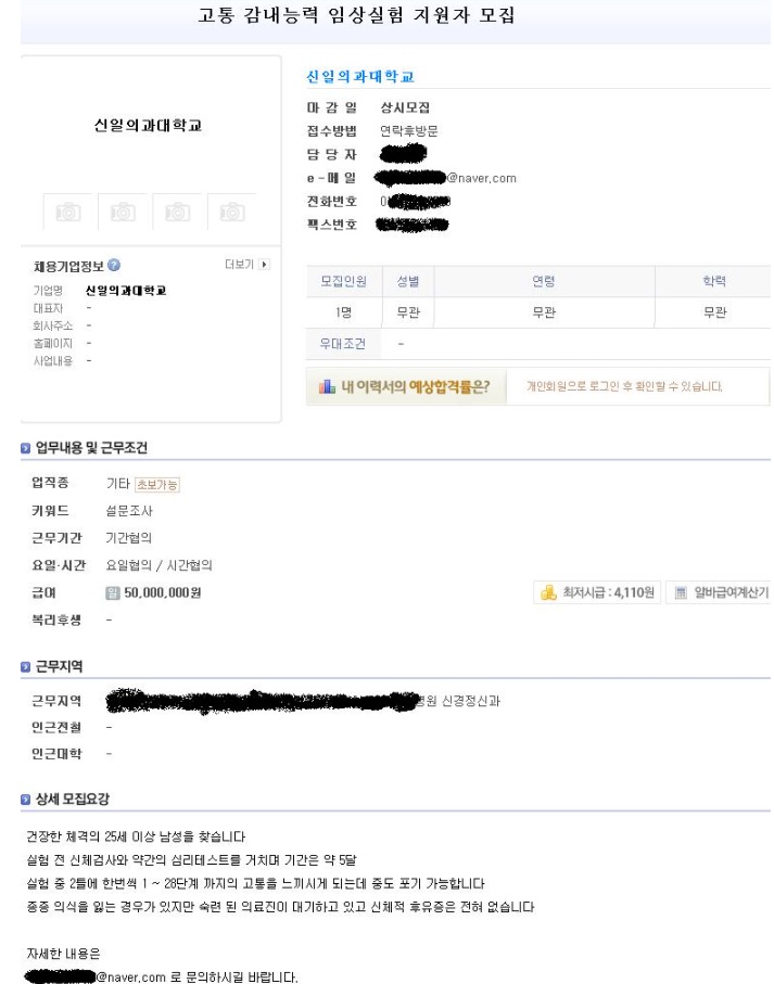 보니까 S의과대학교에 '고통 감내능력 임상실험 지원자 모집'을 모집하는 공고 였다