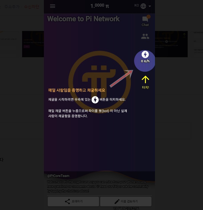 어플 설치가 끝나면 파이 코인 어플을 실행 합니다 그러면 요런 화면이 나옵니다