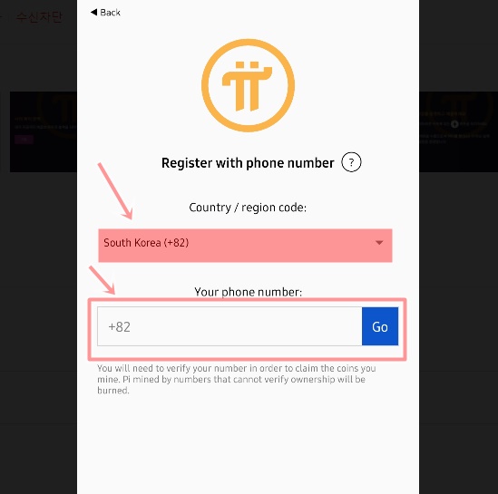 서울 +82 코리아를 선택하시고 폰 넘버에 내 휴대폰 번호를 입력하고 Go 버튼을 누릅니다