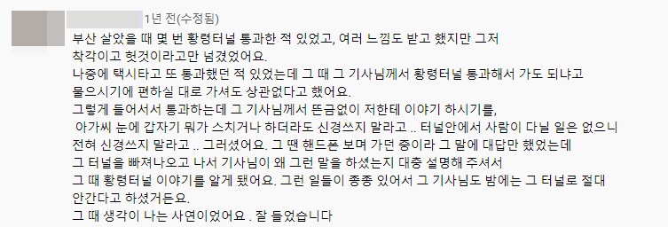 한 유튜브 영상 댓글에 올라와 있던 황령터널 얘기다 허구가 아닌 사실이라는 증거로 볼수 있다