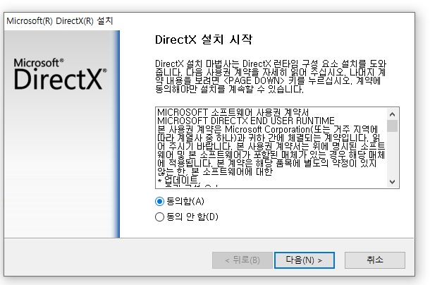 다이렉트x 설치 화면이 나옵니다 이미 설치하신분은 이 화면이 안 나옵니다 설치안하신분들만 나옵니다 필히 설치를 해야 합니다