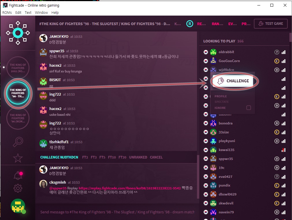 그럼 우측에 그 게임이 표시가 됩니다 그리고 우측에 온라인 사용자들이 나옵니다 대결 하고 싶으시면 그 사람 닉네임에 마우스 오른쪽을 클릭해서 CHALLENGE(결투신청)을 하시면 딥니다