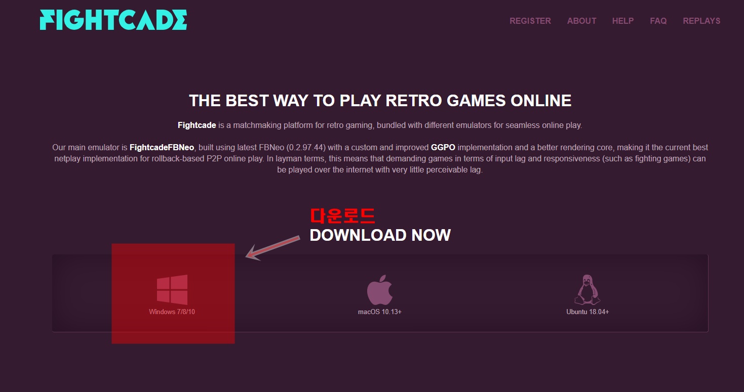 이제 메인 화면으로 돌아가서 Windows 7/8/10 버전용 파이트케이드2를 다운로드를 받으시면 됩니다 맥 사용자는macOS 10.13+ 최신버전을 다운로드를 하시면 됩니다.