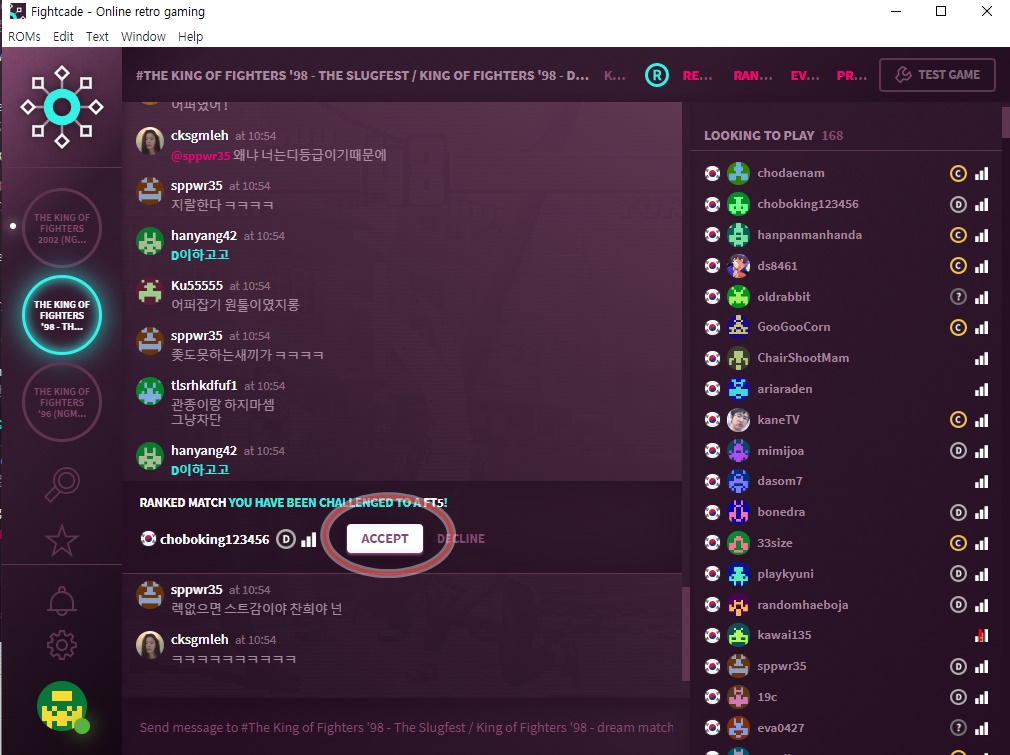 또는 다른 사용자들이 대결을 신청해 옵니다 화면과 같이 ACCEPT 가 표시가 되면은 클릭해서 대결을 하시면 됩니다