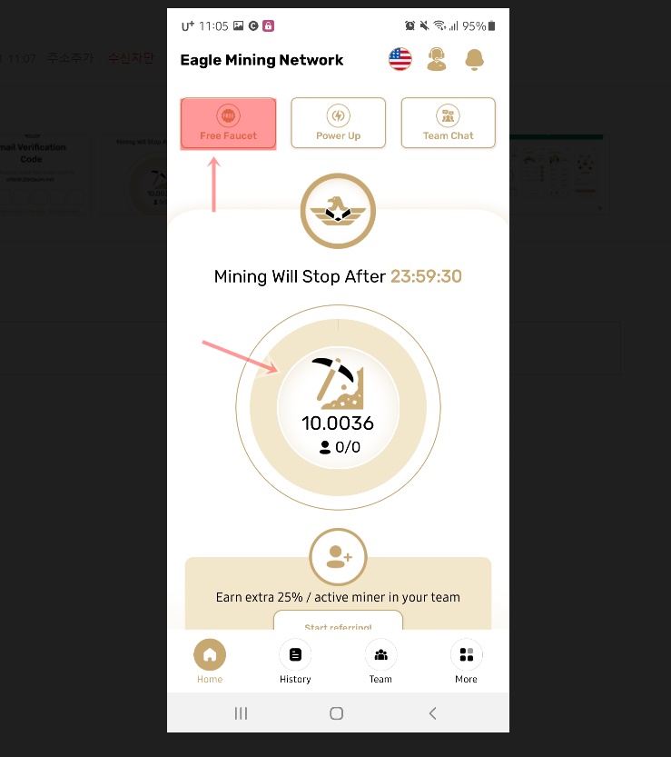 이제 가입이 끝나고 가운데 곡괭이를 누르시면 채굴이 됩니다 24시간에 한 번 채굴을 할 수 있습니다