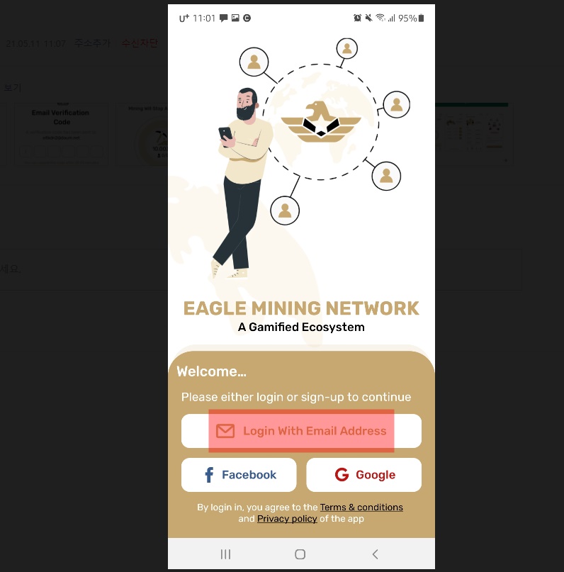 이글코인 어플을 실행 하시면 회원가입 화면이 나옵니다 이메일 가입이 쉬워요!