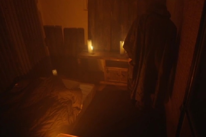 안으로 들어가니 전기가 들어오지 않는지 여러개의 촛불이 어둠을 밝히고 있었다 근데 벽에 문이 하나보였는데 자물쇠로 굳게 잠겨 있는 문이었다 그런데 할아버지는 차를 내어주셨는데 차가 차가웠다 이상했지만 차를 마시면서 마주 본 할아버지는 차분한 인상이었다.