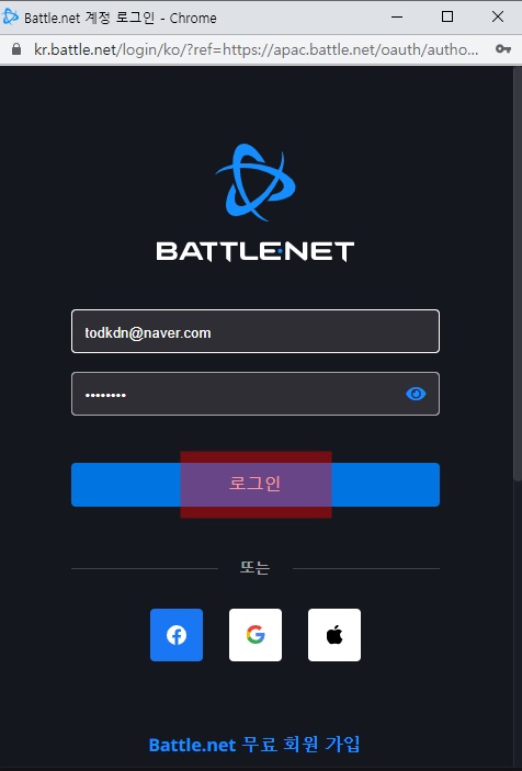 블리자드 로그인 화면이 나옵니다 아이디와 비밀번호를 입력하고 로그인을 합니다 아이디가 없으시면 맨 밑에 무료 회원 가입을 하고 로그인을 하시면 됩니다