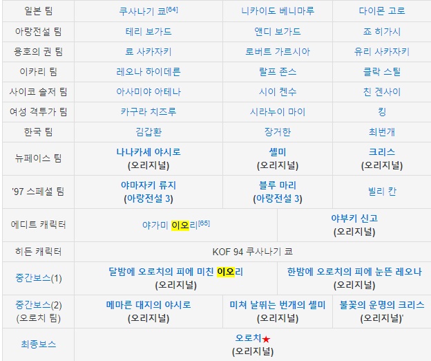 [KOF] 더 킹 오브 파이터즈 97, 전 캐릭터 기술표