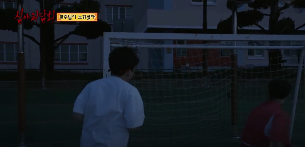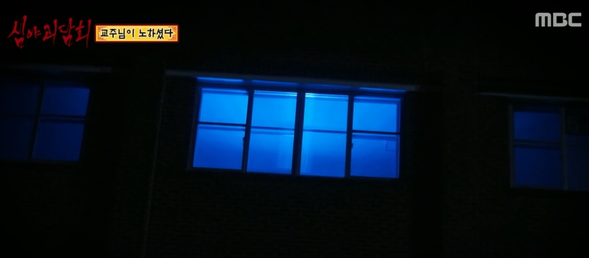 밤 늦게까지 이어진 축구 시합이 되었다 1~2시간 후 너무 더워서 물을 마시고 잠시 쉬고 있는데 빈 교실에서 파란 불빛이 새어 나왔다.